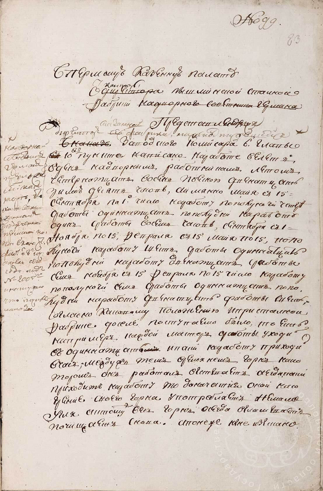 Отношение директора Пышминской стальной фабрики надворного советника Германа в Пермскую казённую палату с предложением ввести на фабрике посменную круглосуточную работу. 10 мая 1786 г. ГАСО. Ф. 583. Оп. 1. Д. 13. Л. 83-83 об.
