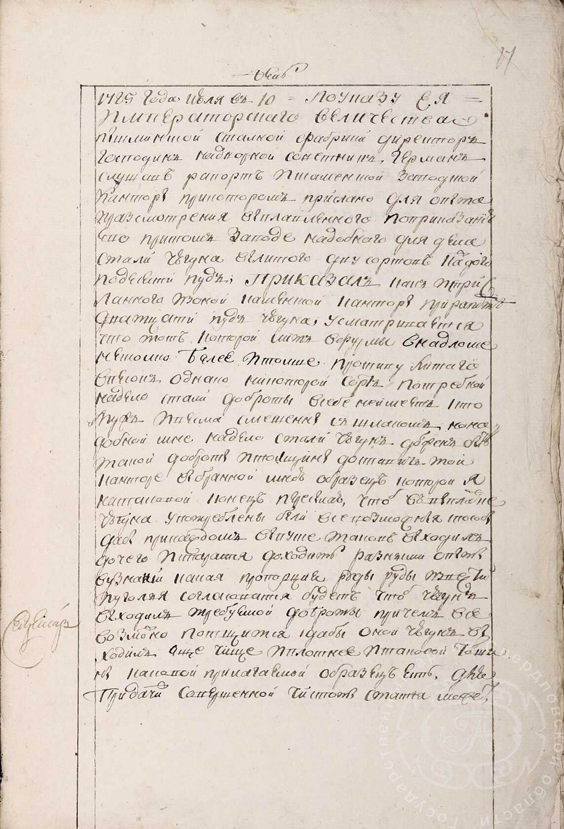Протокол заседания конторы Пышминской стальной фабрики под председательством директора фабрики Германа о поставках на фабрику чугуна необходимого качества с Каменского завода. 10 июля 1785 г. ГАСО. Ф. 583. Оп. 1. Д. 2. Л. 17-18