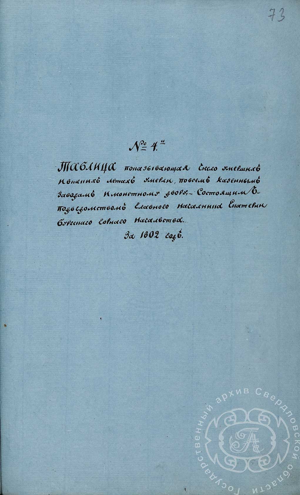 Статистическая таблица об умерших по казённым заводам и монетному двору, состоящим под ведомством Екатеринбургского горного начальства, за 1802 г. ГАСО. Ф. 24. Оп. 2. Д. 1902. Л. 73-74