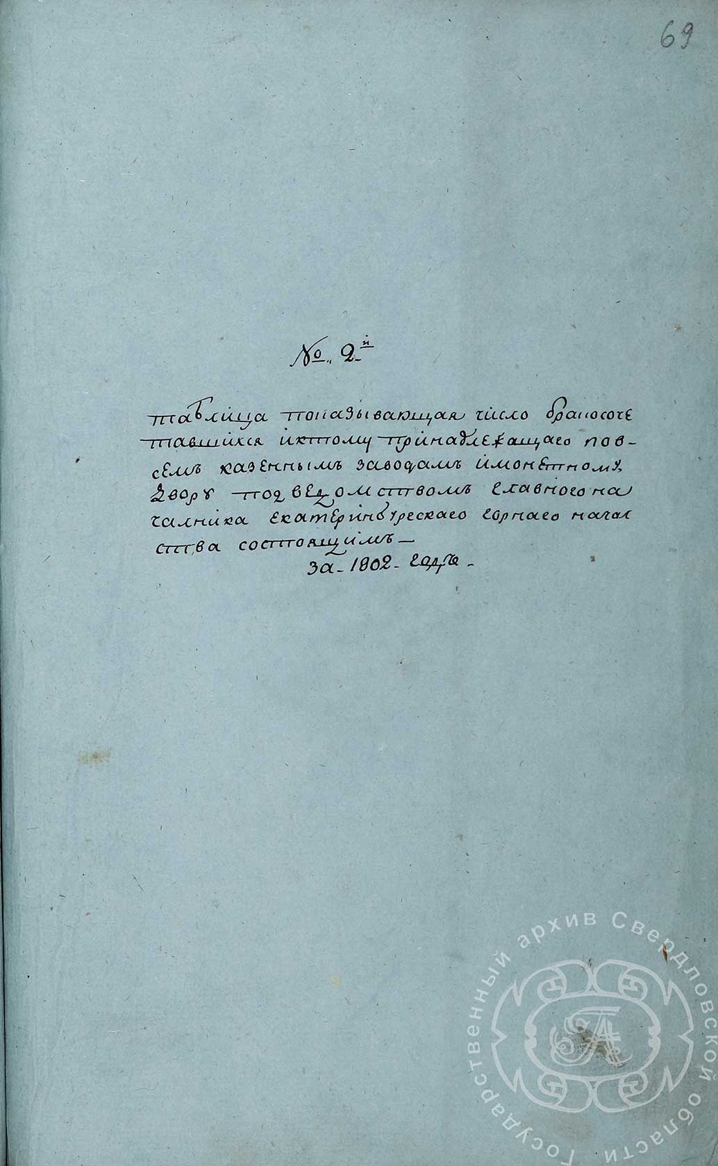 Статистическая таблица о бракосочетавшихся по казённым заводам и монетному двору, состоящим под ведомством Екатеринбургского горного начальства, за 1802 г. ГАСО. Ф. 24. Оп. 2. Д. 1902. Л. 69-70
