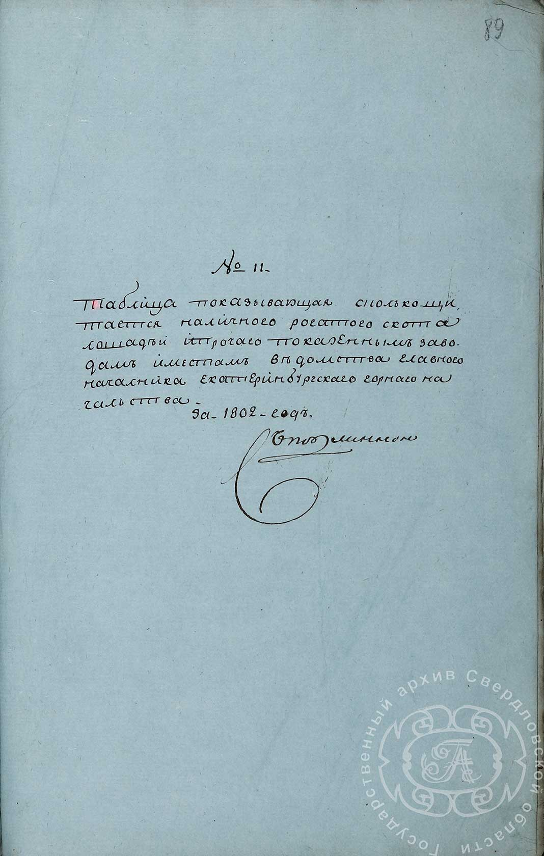 Статистическая таблица о количестве рогатого скота, лошадей и прочих животных по казённым заводам и монетному двору, состоящим под ведомством Екатеринбургского горного начальства, за 1802 г. ГАСО. Ф. 24. Оп. 2. Д. 1902. Л. 89-90