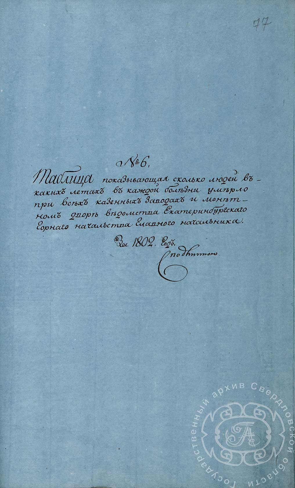 Статистическая таблица, «показывающая, сколько людей в каких летах в каждой болезни умерло» по казённым заводам и монетному двору, состоящим под ведомством Екатеринбургского горного начальства, за 1802 г. ГАСО. Ф. 24. Оп. 2. Д. 1902. Л. 77-78