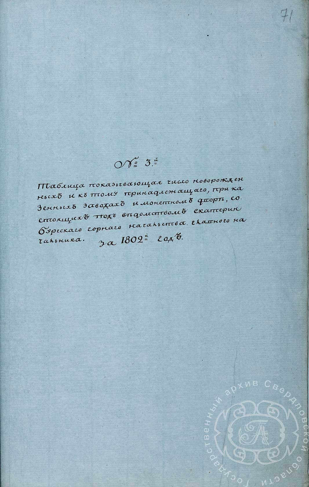 Статистическая таблица о новорождённых по казённым заводам и монетному двору, состоящим под ведомством Екатеринбургского горного начальства, за 1802 г. ГАСО. Ф. 24. Оп. 2. Д. 1902. Л. 71-72