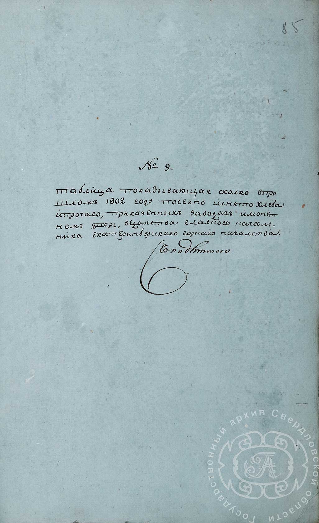 Статистическая таблица о хлебных посевах по казённым заводам и монетному двору, состоящим под ведомством Екатеринбургского горного начальства, за 1802 г. ГАСО. Ф. 24. Оп. 2. Д. 1902. Л. 85-86