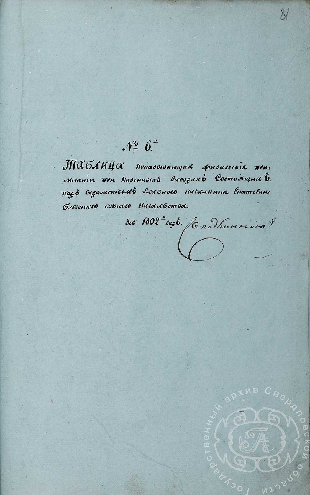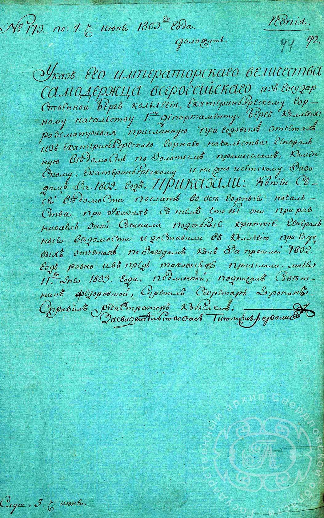 Указ Государственной Берг-коллегии Екатеринбургскому горному начальству об отправке во все горные начальства копий генеральной ведомости по заводам и золотым промыслам Екатеринбургского горного начальства за 1802 г., в качестве примера для составления аналогичных ведомостей всеми горными начальствами. 4 июня 1803 г. ГАСО. Ф. 24. Оп. 2. Д. 1902. Л. 94