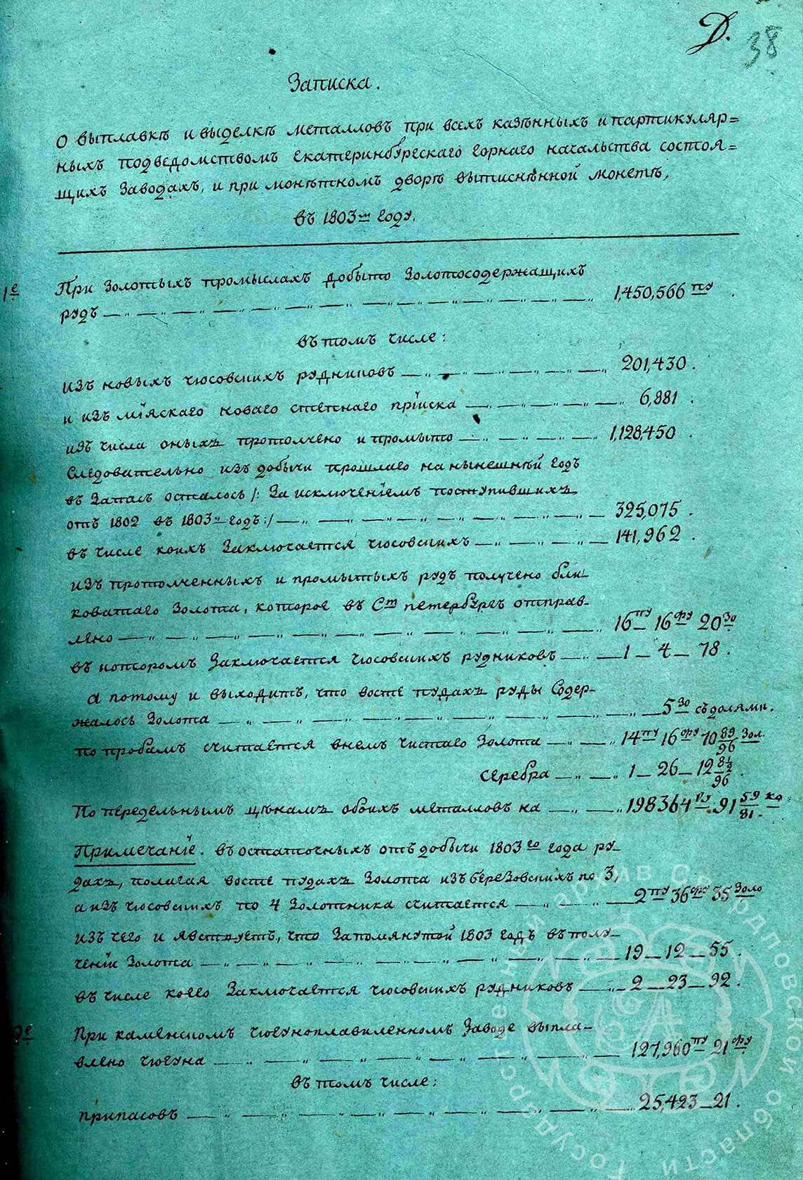 Записка о выплавке и выделке металлов при всех казённых и партикулярных заводах, состоящих под ведомством Екатеринбургского горного начальства, и при монетном дворе вытесненной монете. 1804 г. ГАСО. Ф. 24. Оп. 2. Д. 1909. Л. 38-39