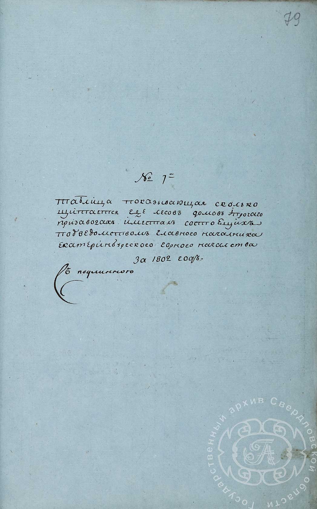 Статистическая таблица о количестве лесов, домов и прочих строений по казённым заводам и монетному двору, состоящим под ведомством Екатеринбургского горного начальства, за 1802 г. ГАСО. Ф. 24. Оп. 2. Д. 1902. Л. 79-80