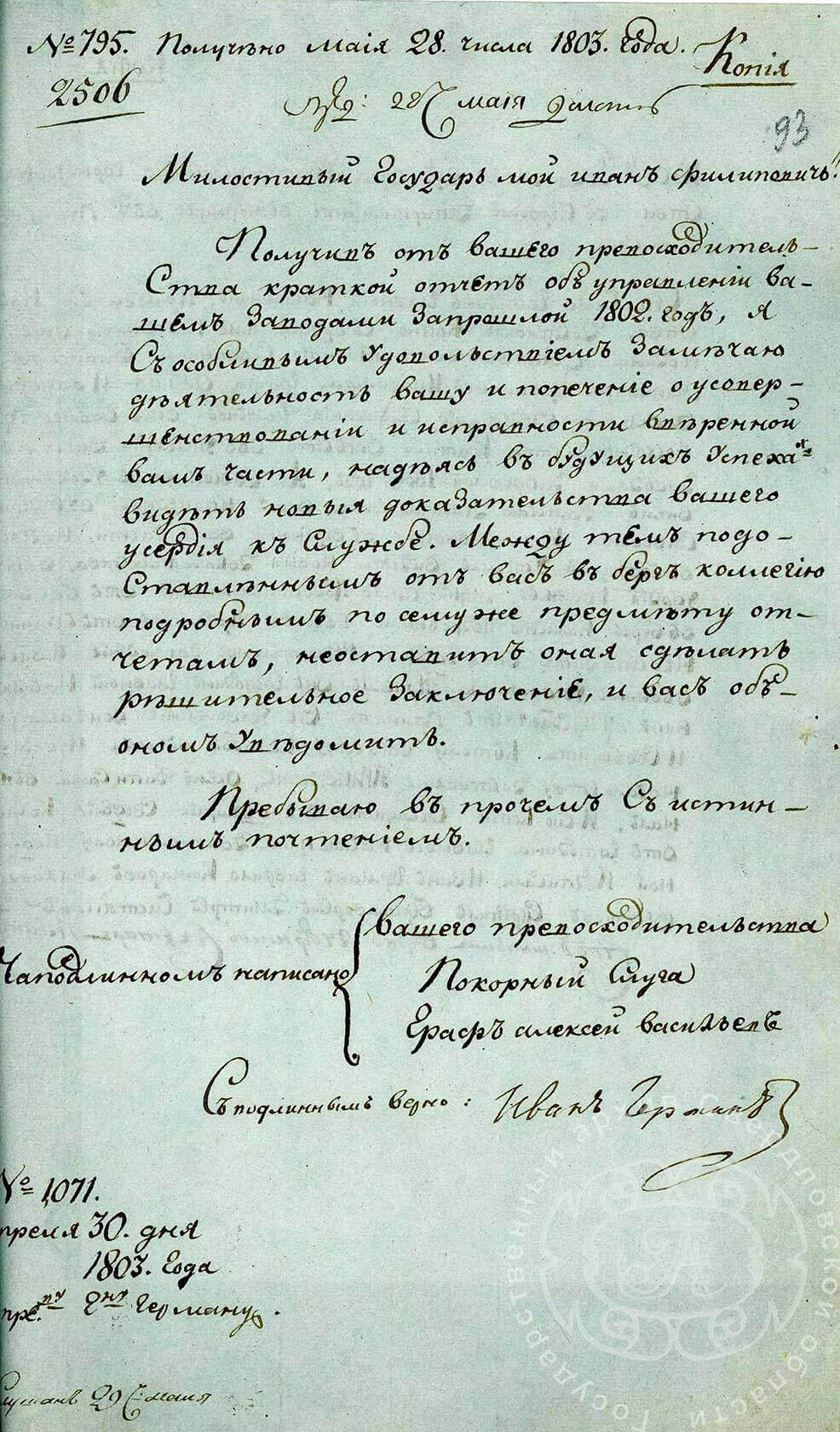 Ордер действительного тайного советника, сенатора, министра финансов графа А.И. Васильева главному начальнику Екатеринбургского горного начальства обер-берг-гауптману 4-го класса И.Ф. Герману о получении отчёта за 1802 г., а также с одобрением деятельности последнего. 30 апреля 1803 г. ГАСО. Ф. 24. Оп. 2. Д. 1902. Л. 93