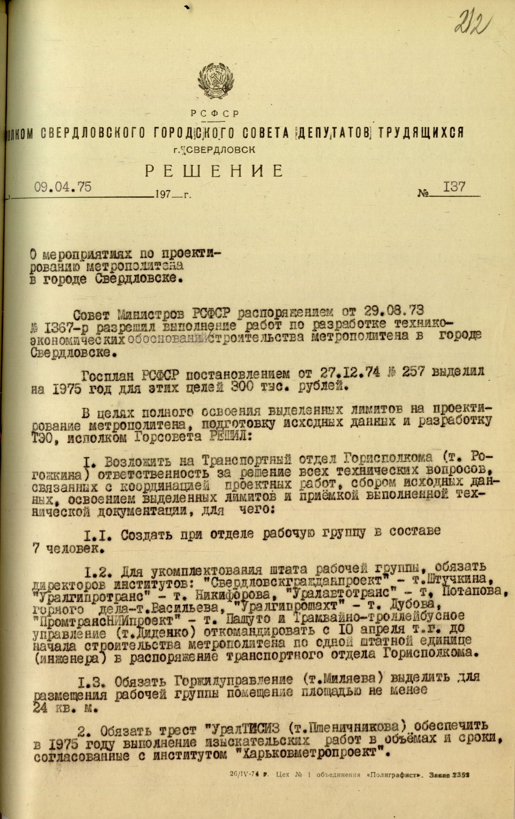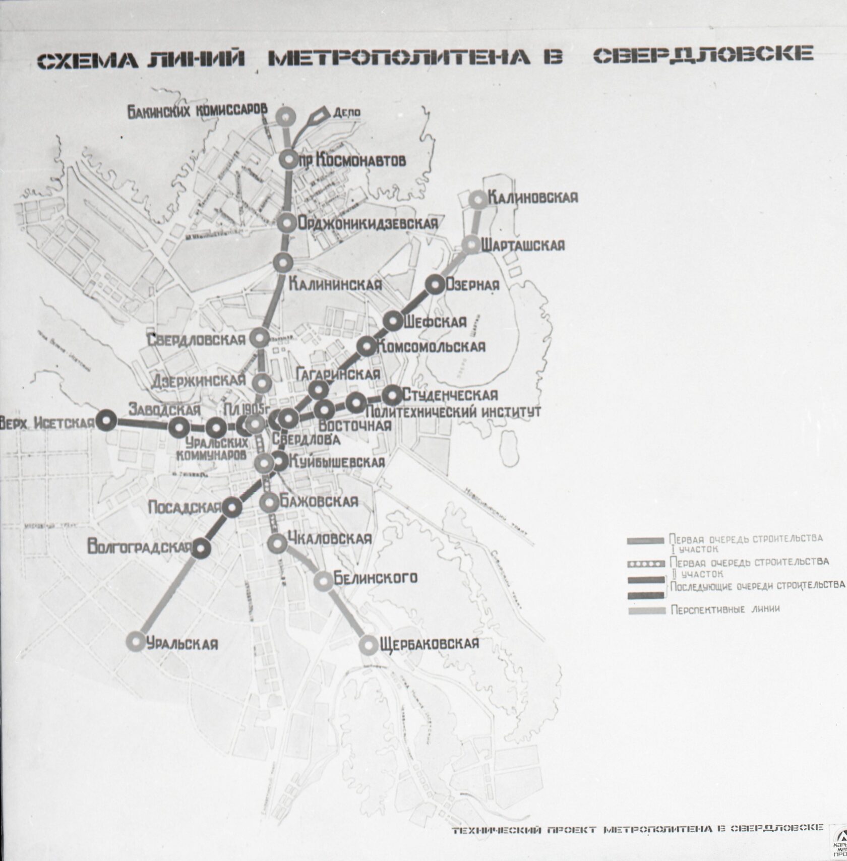 В 1975 г. началось проектирование метрополитена в г. Свердловске институтом «Харьковметропроект». Им было выполнено технико-экономическое обоснование (ТЭО) 1-й очереди Свердловского метрополитена. На этом основании были проложены линии. Первая должна была начинаться на пл. 1-й Пятилетки, пройти под заводской территорией Уралмаша к пр. Космонавтов к железнодорожному вокзалу, затем в район Городского пруда, к площади 1905 г. и далее на юг. Вторая – пройти с востока на запад от Каменных палаток до Виза. Третья с Юго-Запада в район озера Шарташ. Проекты многократно пересматривались.