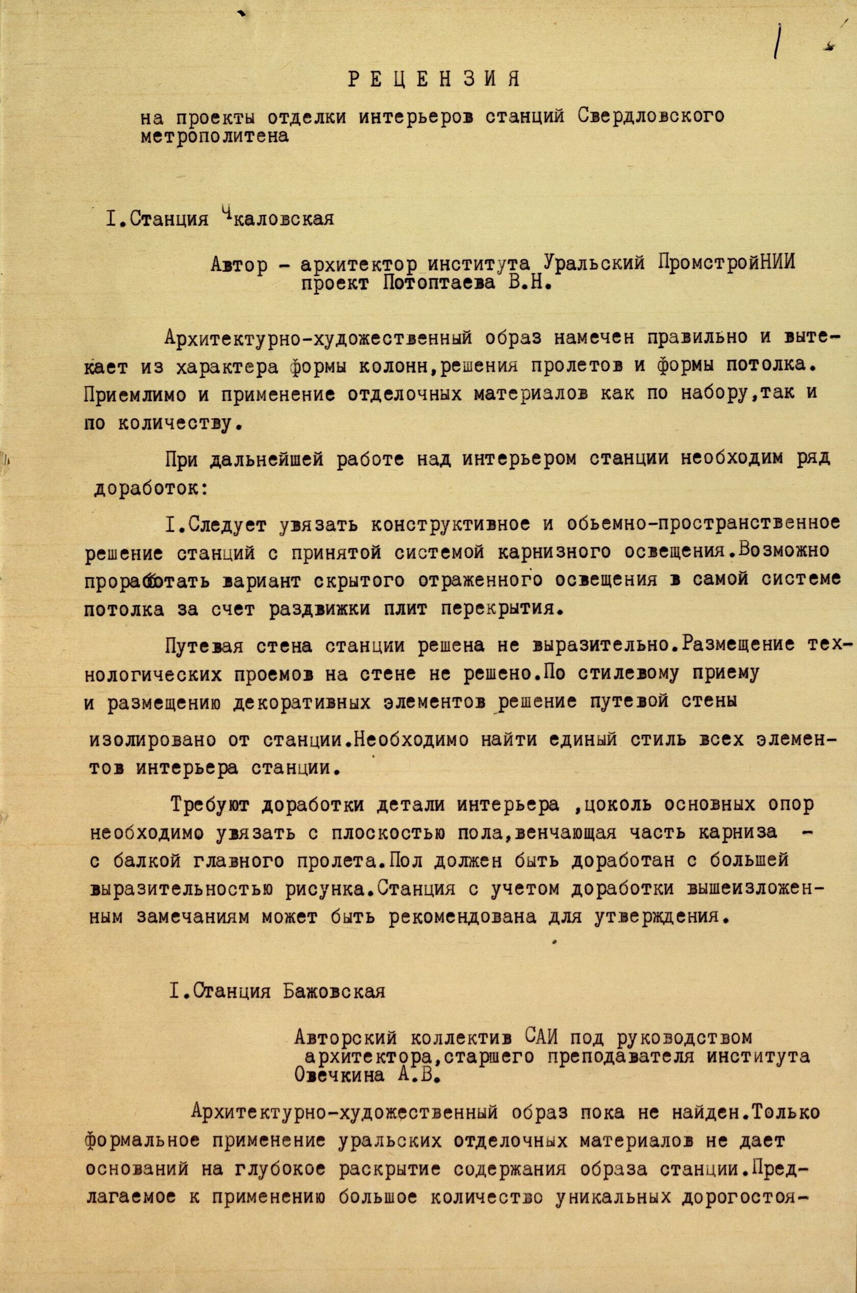 В ноябре 1980 г. вышло распоряжение Совета Министров СССР об утверждении технического проекта первой очереди Свердловского метрополитена от станции Проспект Космонавтов до станции Чкаловская
