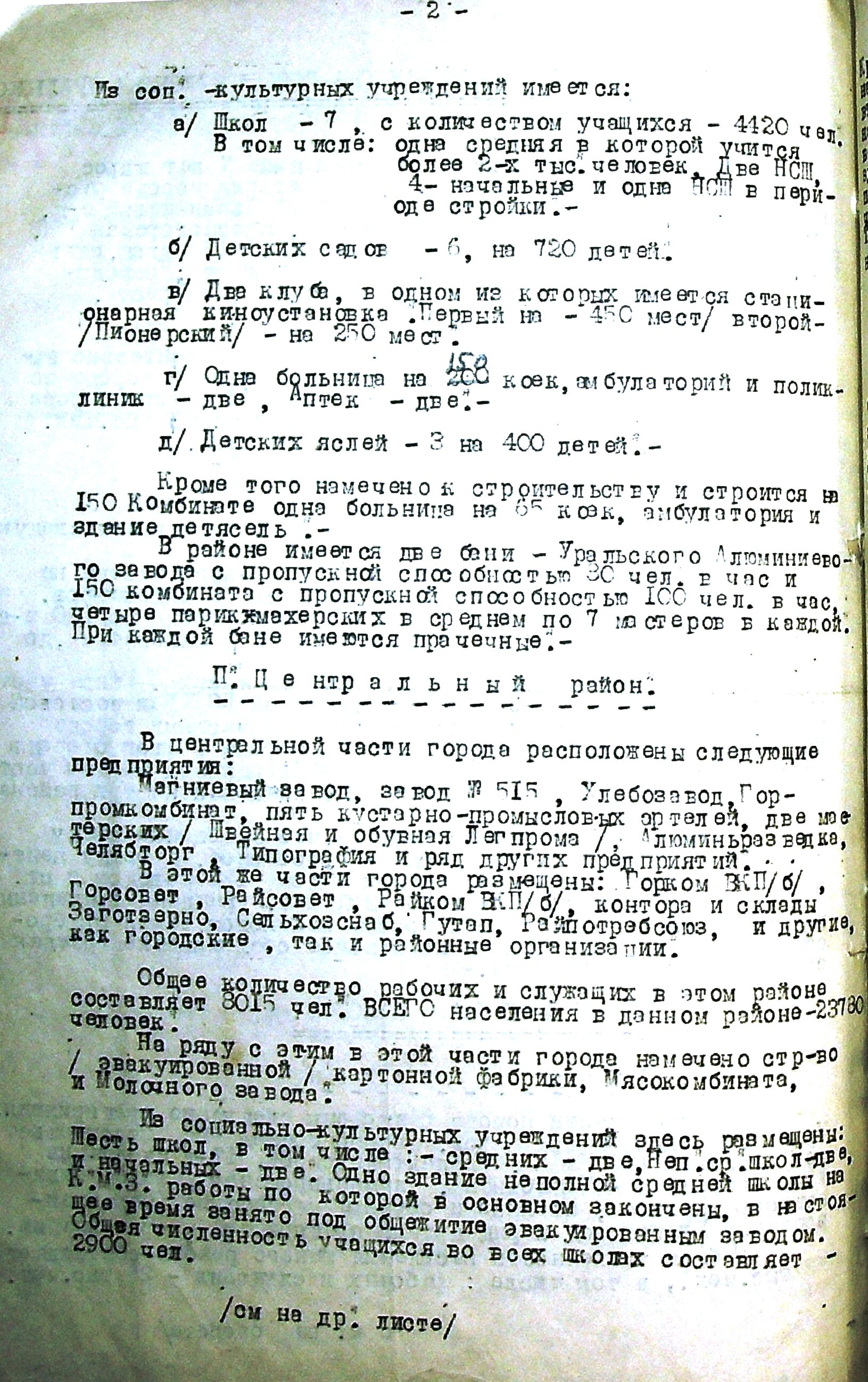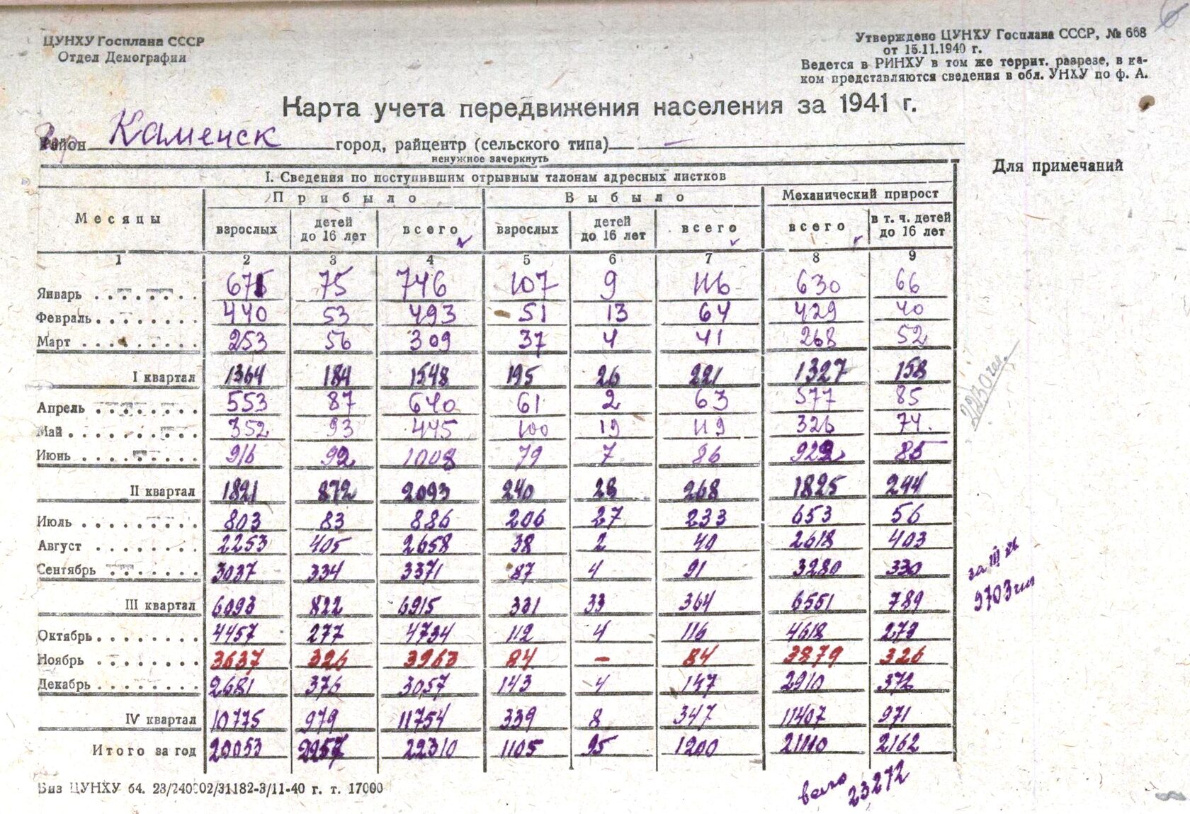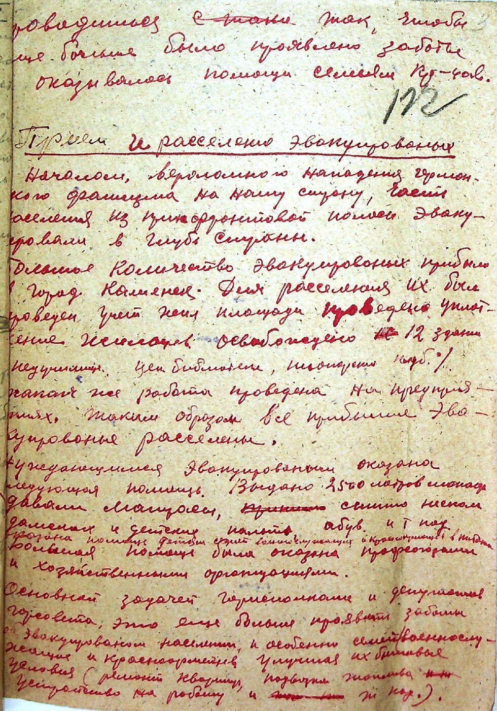 Большое количество эвакуированных прибыло в город Каменск. Для расселения их был проведён учёт жилплощади, проведено уплотнение жильцов, освобождены 12 зданий, педагогическое училище, центральная библиотека, пионерский клуб. Таким образом, все прибывшие эвакуированные расселены".
