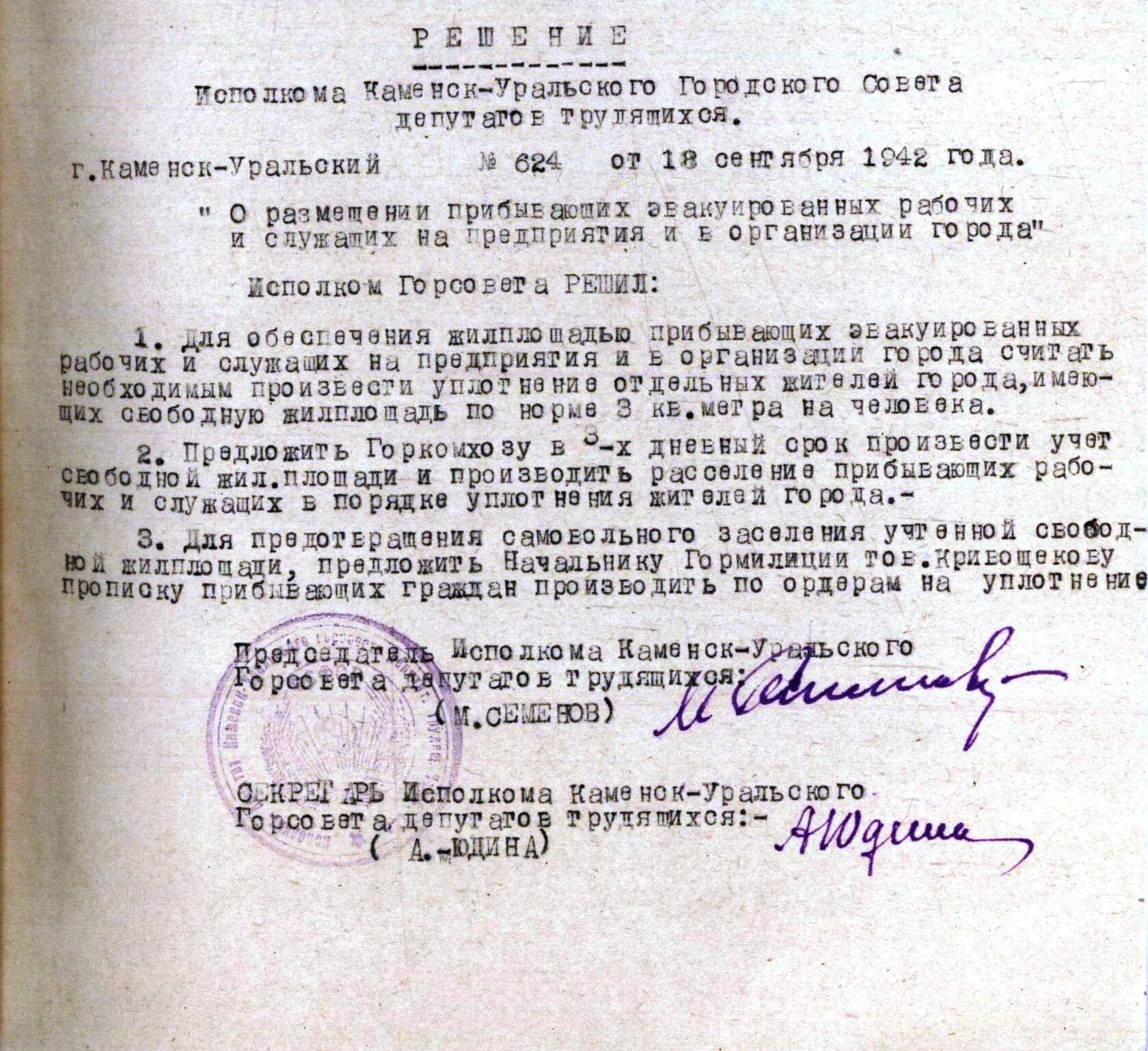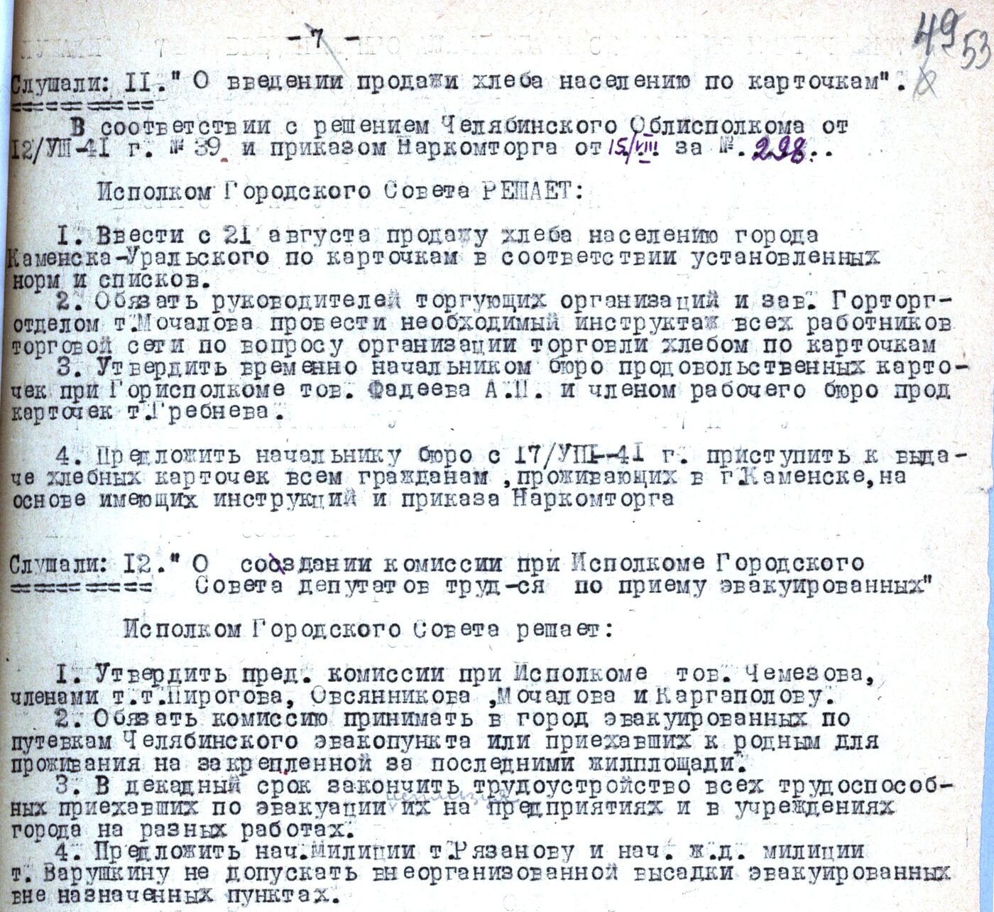 Решение № 11 от 22.08.1941 исполкома Каменск-Уральского