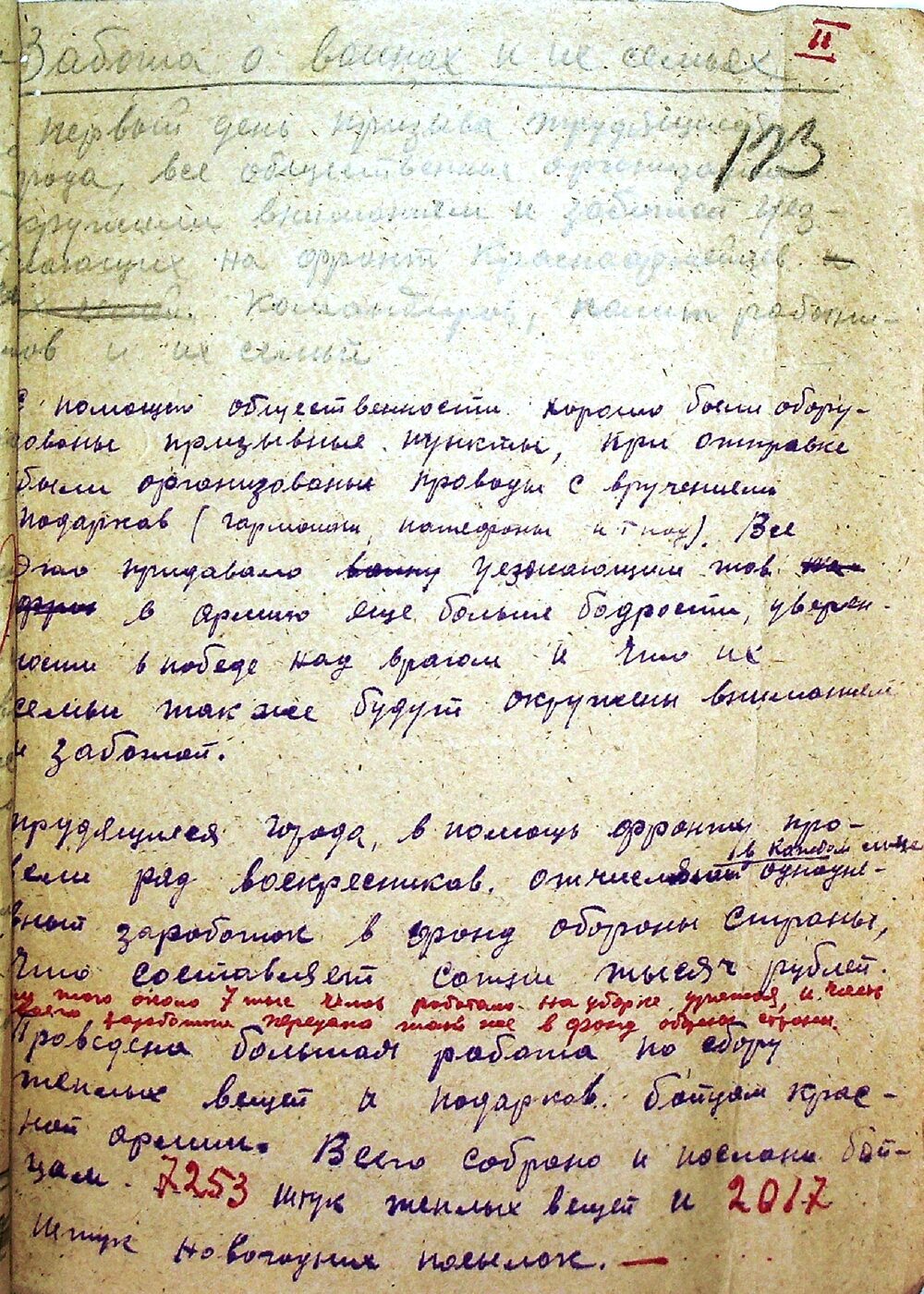 С помощью общественности хорошо были оборудованы призывные пункты, при отправке были организованы проводы с вручением подарков (гармошки, патефоны и тому подобное). Всё это придавало уезжающим в армию товарищам ещё больше бодрости, уверенности в победе над врагом и что их семьи также будут окружены вниманием и заботой. Трудящимися города в помощь фронту проведён ряд воскресников, каждый месяц отчисляется однодневный заработок в фонд обороны страны, что составляет сотни тысяч рублей. Кроме того около 7000 человек работает на уборке урожая и часть своего заработка также передали в фонд обороны страны. Проведена большая работа по сбору теплых вещей и подарков бойцам Красной армии. Всего собрано и выслано бойцам 7253 штуки тёплых вещей и 2017 штук новогодних посылок".