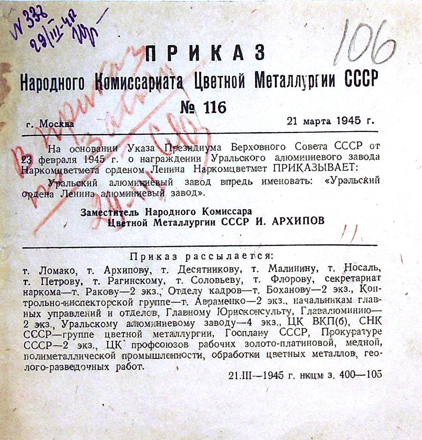 Приказ НКЦМ СССР № 116 от 21.03.1945