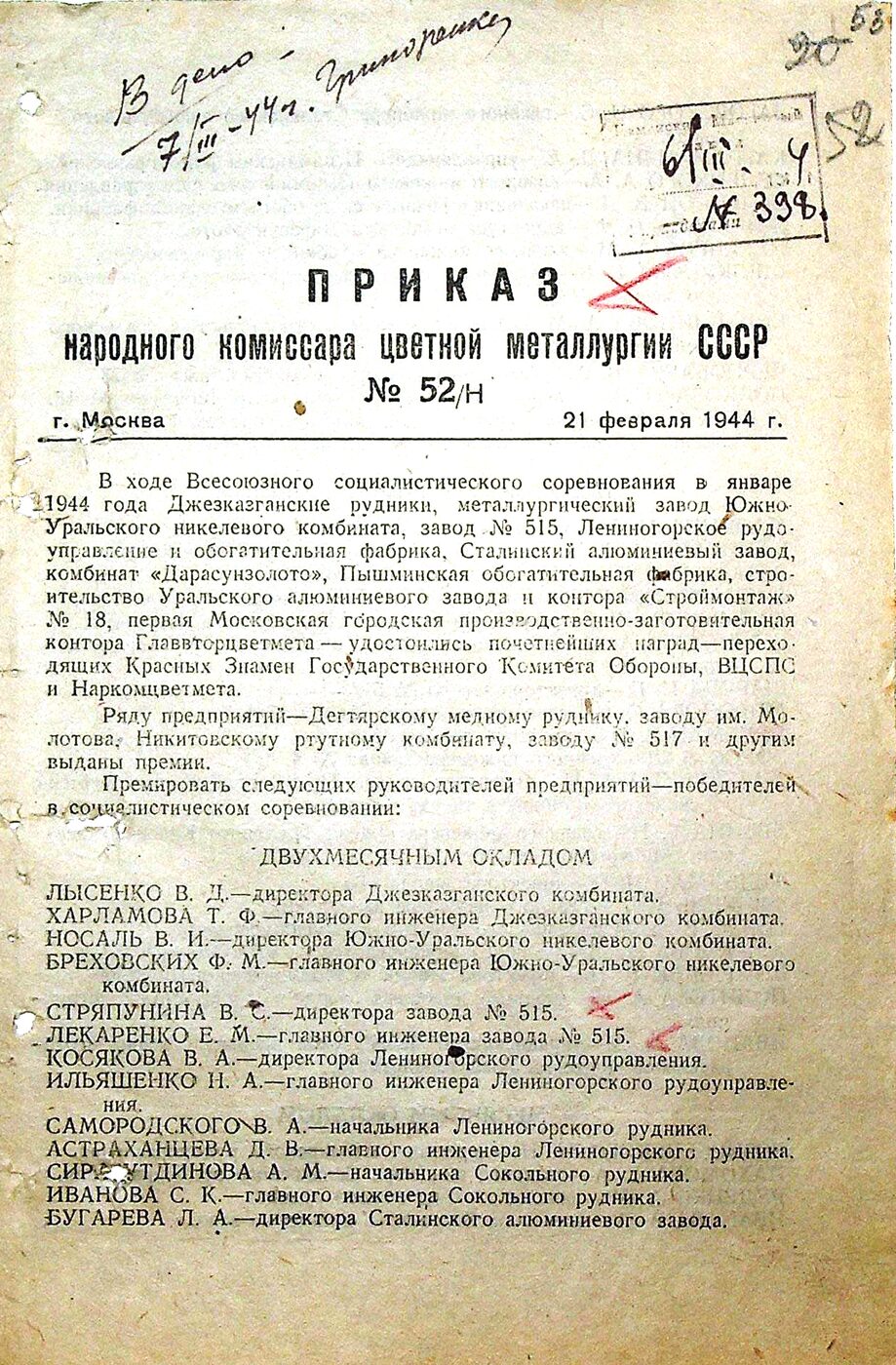 Приказ НКЦМ СССР № 52/н от 21.02.1944