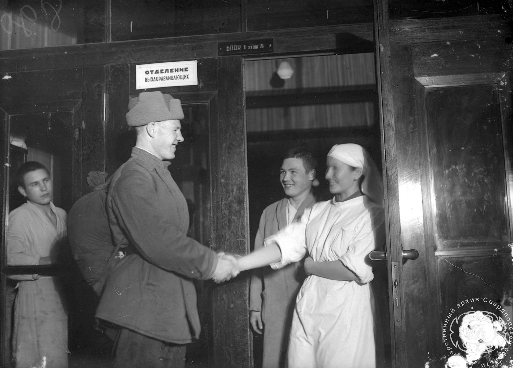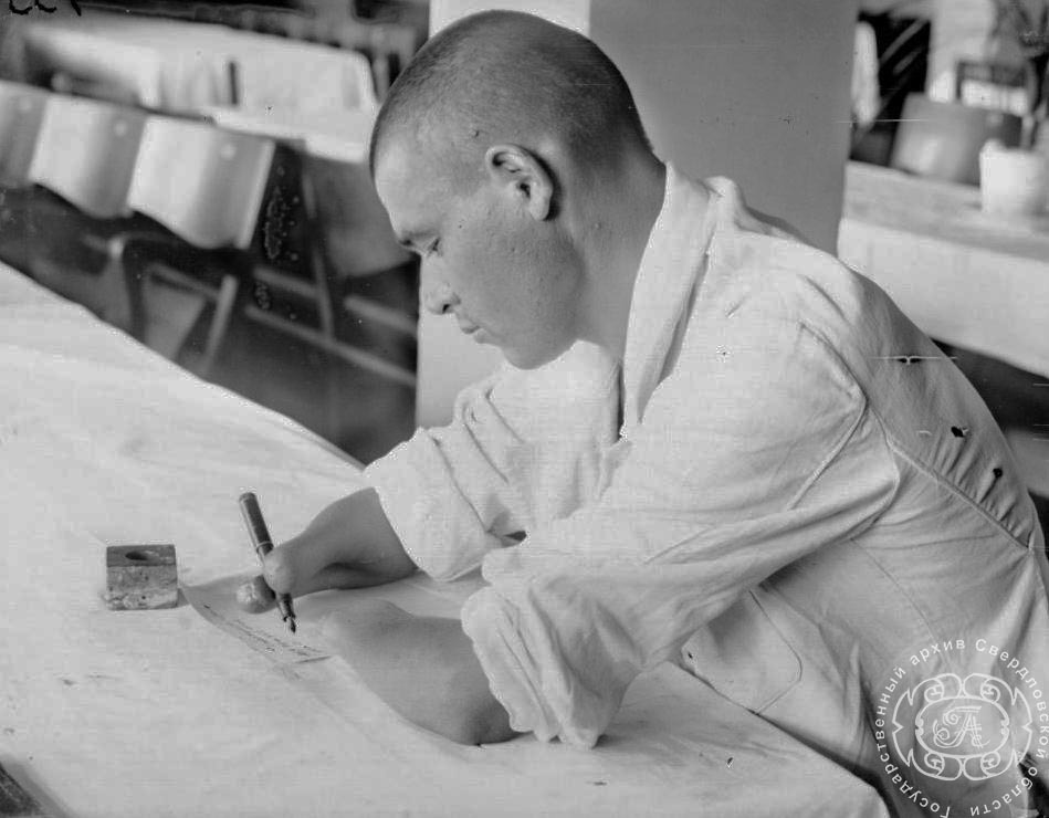 Госпиталь № 414. Бойцы, раненые в руки, со специальной деревянной подставкой. Свердловск.