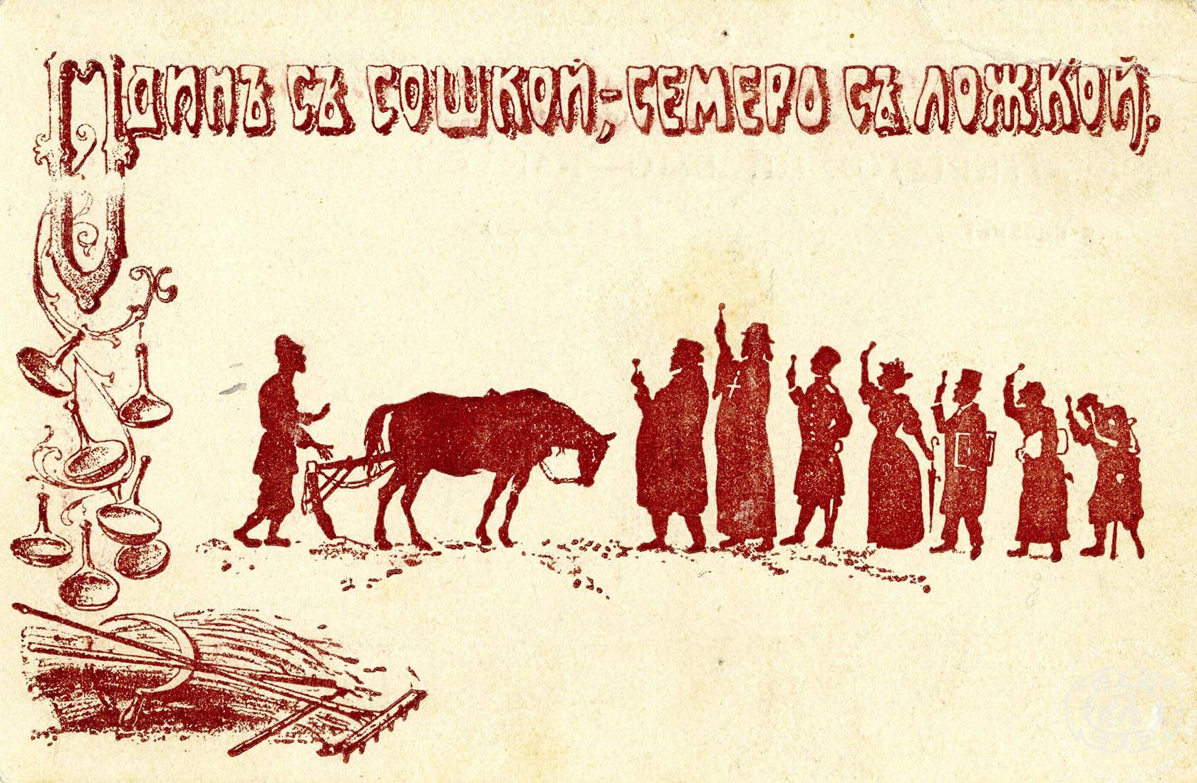 Почтовая открытка «Один – с сошкой, семеро – с ложкой».